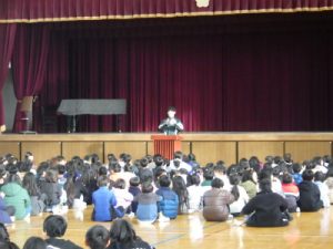 9月以降、どんなことにチャレンジし、どんなことができるようになったでしょうか。今日の朝会では、委員長の認証・赤い羽根作品コンクールの表彰・天王川マラソンの表彰など、今までの取組に対する紹介がたくさんありました。どんなことにでもがんばっている姿は素晴らしいものです。元日には目標を立て、さまざまなことにチャレンジしてほしいものです。