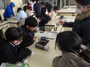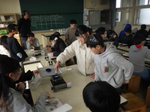 6年生は、理科の学習で、水溶液の性質について学習しています。今回は、各水溶液を熱すると、においや熱した後の様子がどうなるかを実験しました。食塩水や重曹水など、5種類の水溶液を熱します。以前は、アルコールランプやガスバーナーを使っていましたが、今はミニガスコンロを使います。実験器具も時代とともに変わっていきます。
