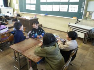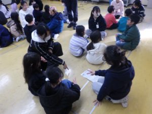 1時間目に、1年生と5年生のあるクラスで、一緒にアドジャンをしたり、じゃんけん列車をしたりしながら楽しく1時間過ごしました。