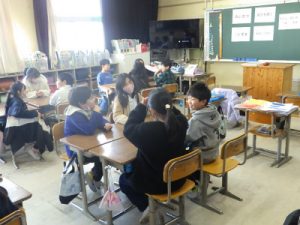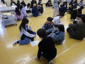 1年生から6年生までの混合班がそれぞれの部屋に分かれてレクリエーションをしました。最初に「Yes/No クイズゲーム」では、児童会が考えた Yes か No で答えることのできるクイズ(15 問程度)を リーダーの6 年生が出題し、出題者以外の児童が解答しました。次に「なぞなぞ」をしました。児童会が考えたなぞなぞを、リーダーが出題しました。ヒントを出しながら、「せーの」の合図で、なぞなぞの答えを全員で言って楽しみました。他にもじゃんけん列車をしたところもあったようです。