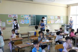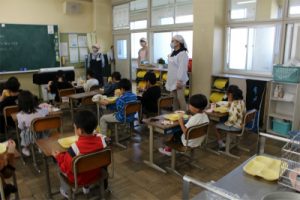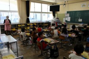日々、給食ボランティアの方々のご協力があり、1年生の給食の準備がスムーズに行えています。おいしい給食を味わいながら笑顔で食べる1年生。6年生も1年生のボランティアに率先して参加しています。「1年生のために」と、学校のリーダーとして活動する姿勢が多く、ボランティアをお願いするのも順番待ちができるほど。さすが6年生。